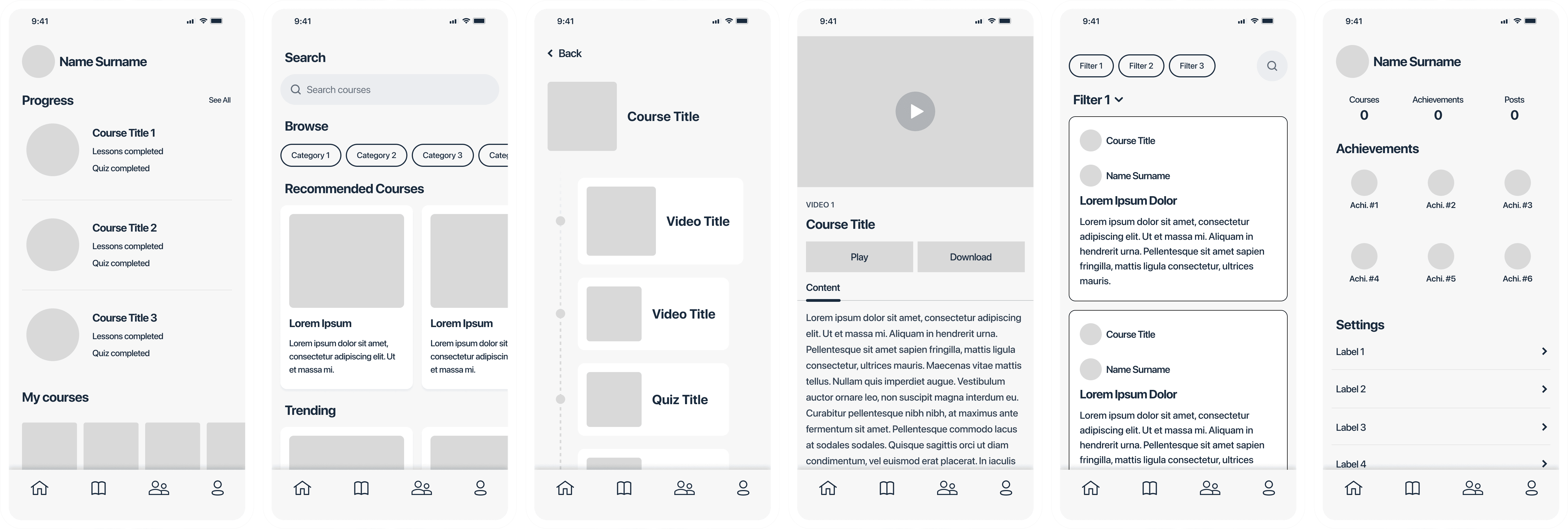First, I sketched the key user flows to understand how users would move through the product. These flows included discovering and enrolling in courses, playing courses offline, participating in forum discussions, and earning badges through achievements.
